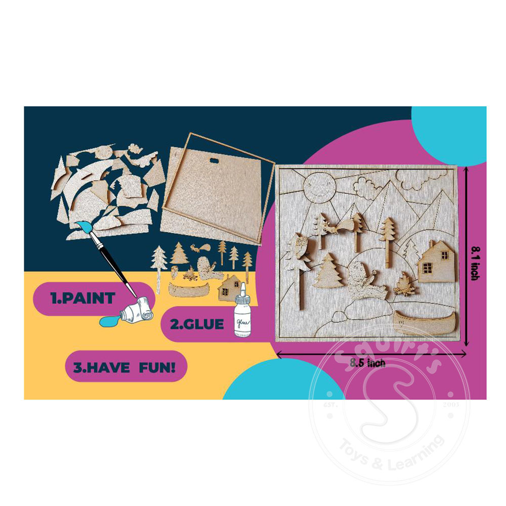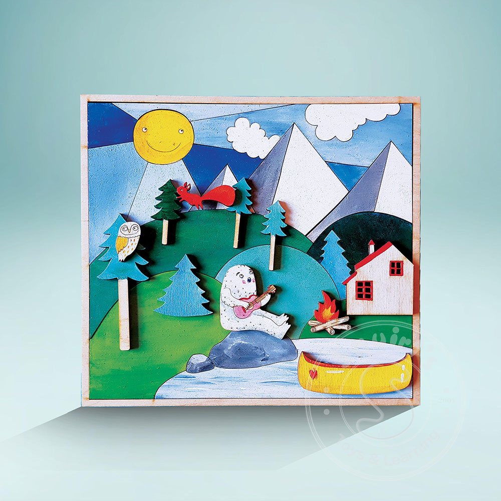 This multi layer cabin on lake is made from premium wood. Fit the puzzle pieces together to create your background layer then add in your trees, animals, campfire, cabin and canoe to complete your creation! Paints, brushes, wood glue and step by step...