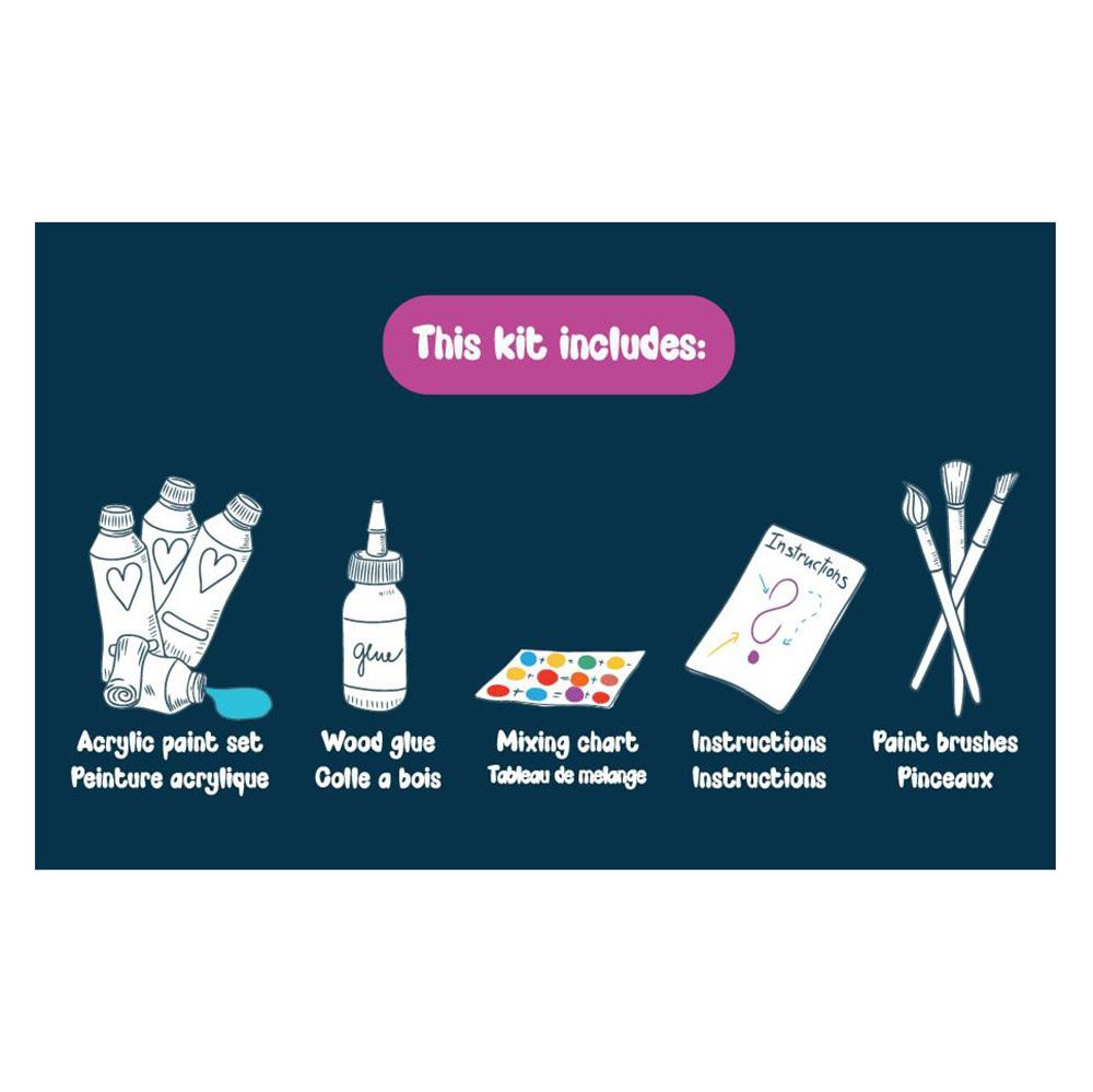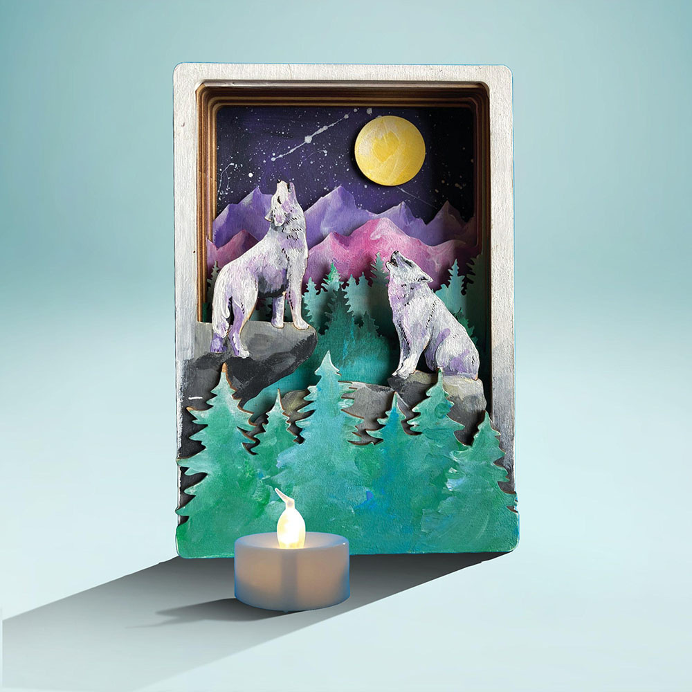 Howling at a full moon. This multi layer kit has a unique feature to light up the night. Made with premium wood. This ready to assemble kit comes with paints, brushes, wood glue, colour mixing guide, instructions and a how to video on our website...