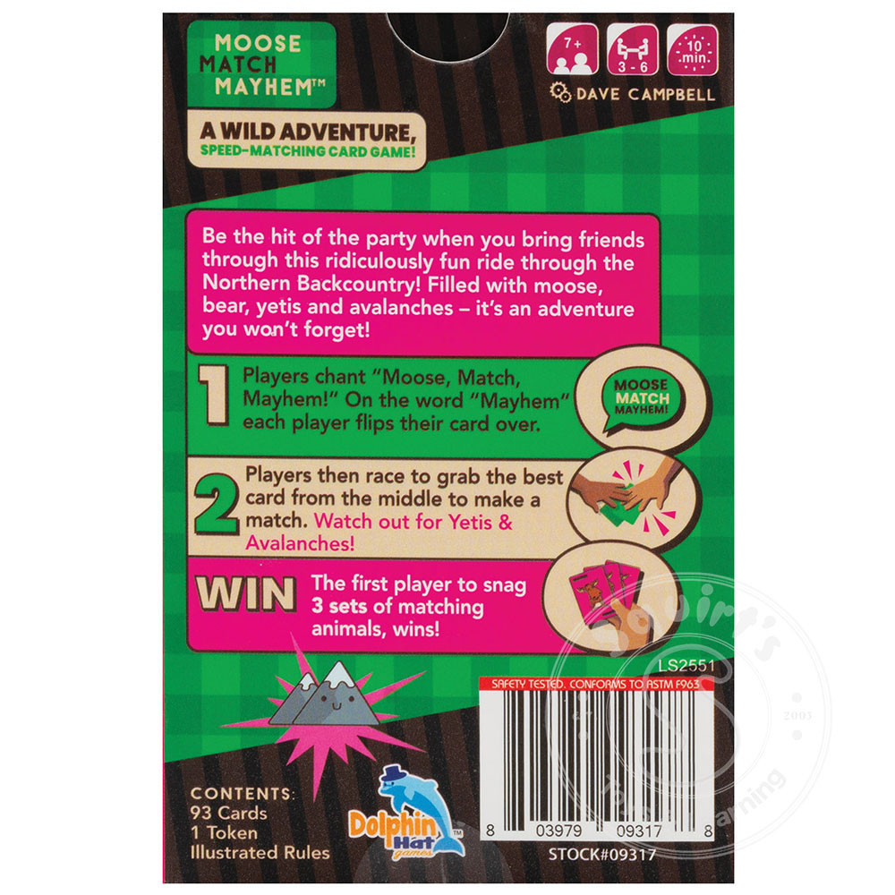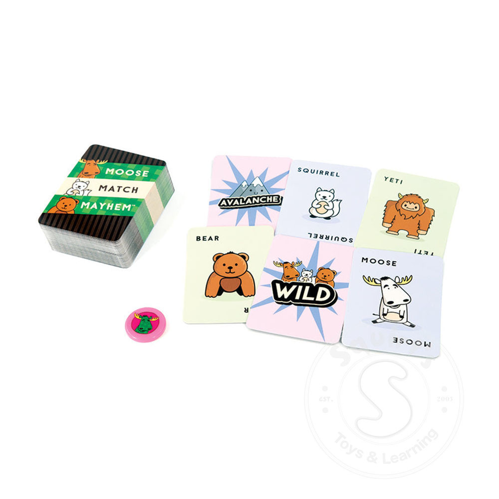 Each player takes a card from the stack. Everyone chants “Moose! Match! Mayhem!” flips their card over and races to grab the best card to make a match. The first player to collect three sets of animals wins!