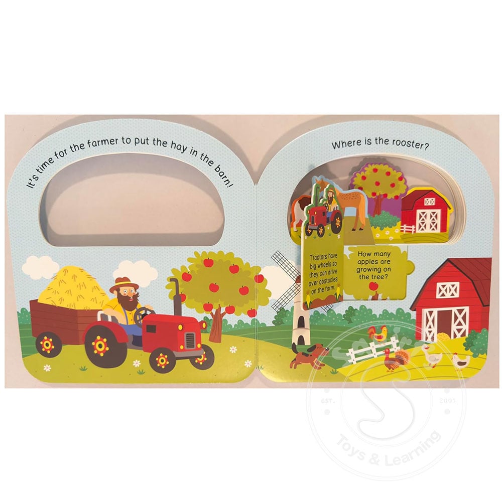 farm life with playful animals, tractors, and everyday farm activities. Lift the chunky flaps to uncover hidden surprises, helping children build observation skills while having fun exploring cows, chickens, pigs, and more!