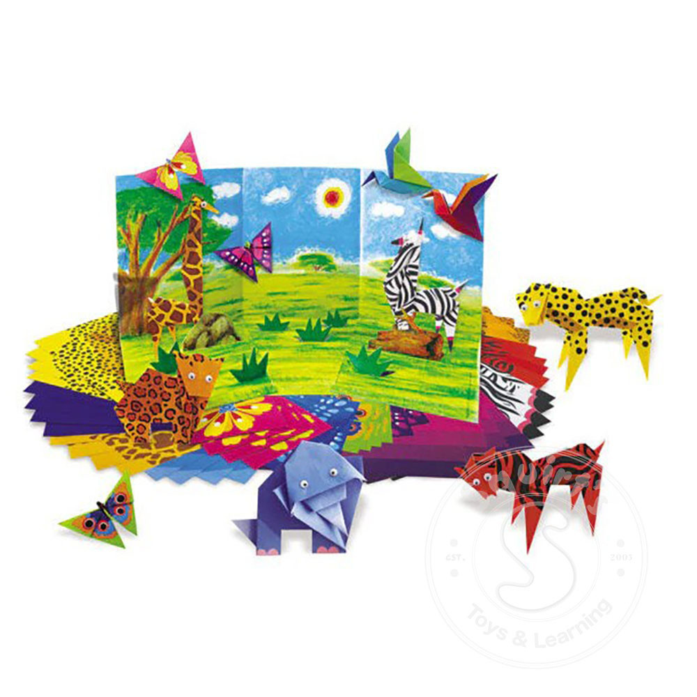 Contents: 1 x pop up play scene, 30 sheets with 7 different animal hide patterns and 4 unique butterfly patterned paper, moving eyes and detailed instructions.