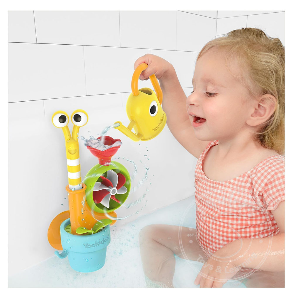 A garden themed bath toy- a flowerpot with a snail that pops up and a water mill that spins. Also includes a watering can that can be used to water the flower on top of the snail and set off a simultaneous surprising reaction....