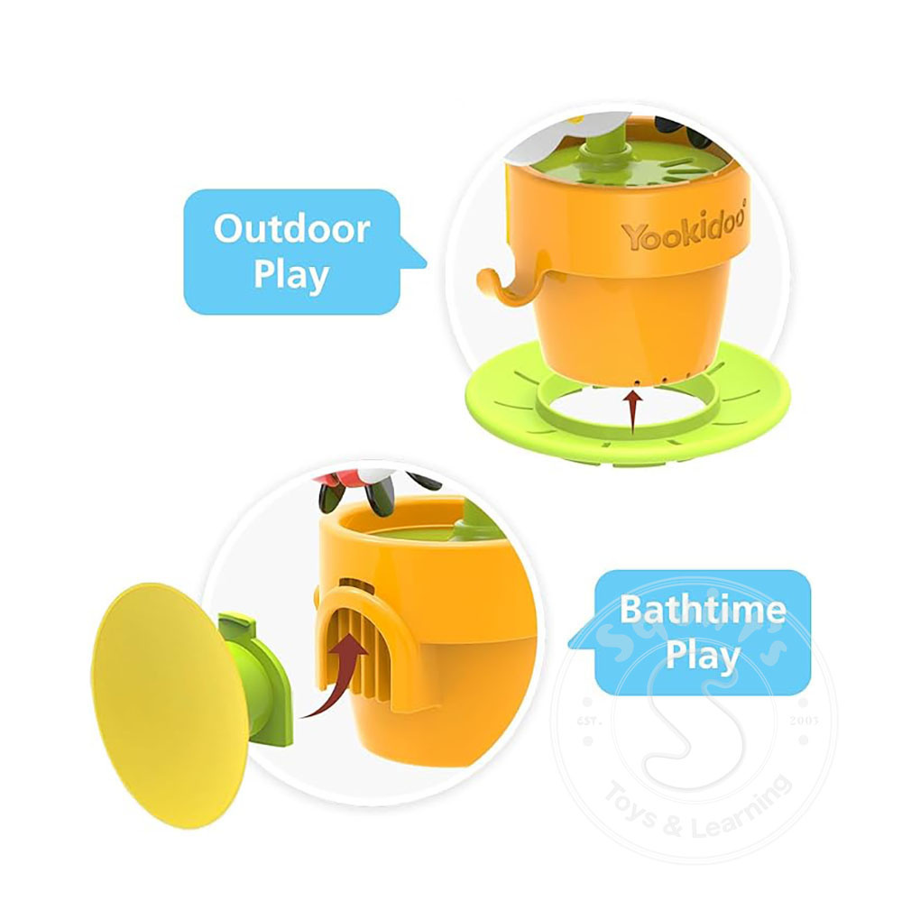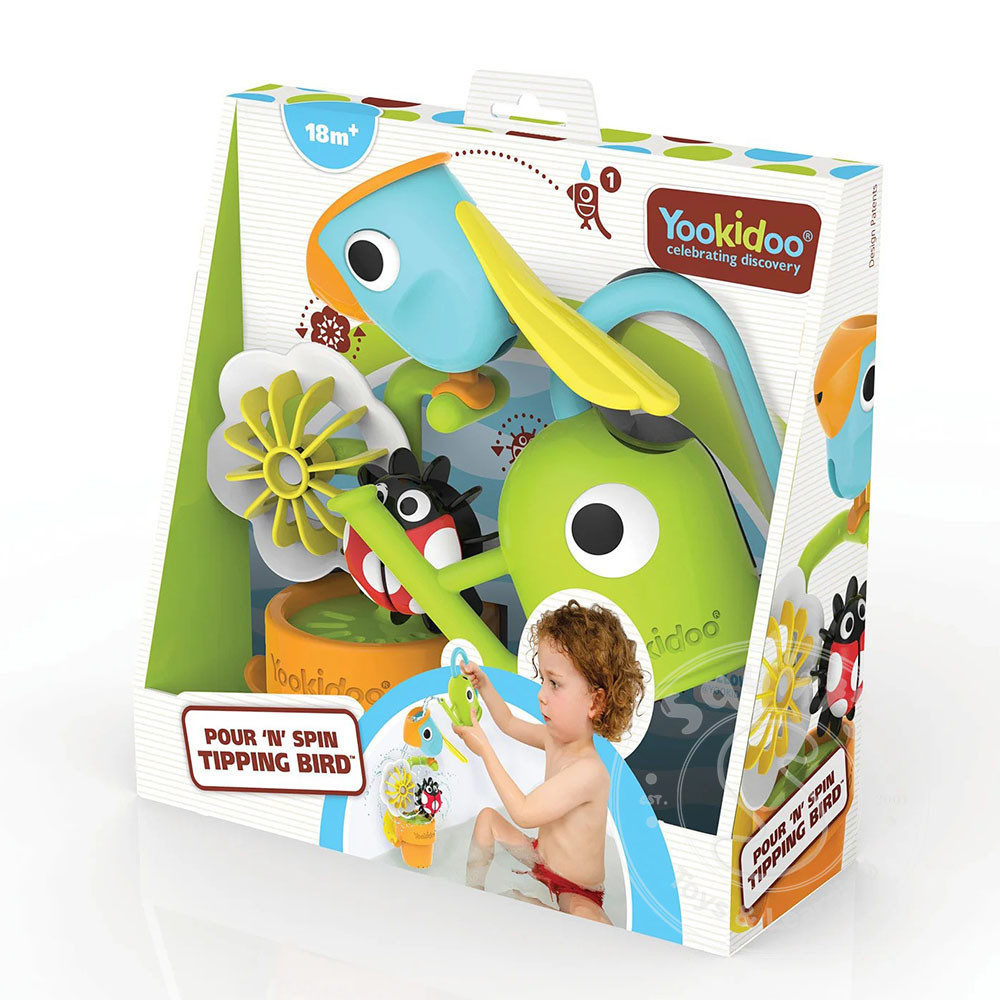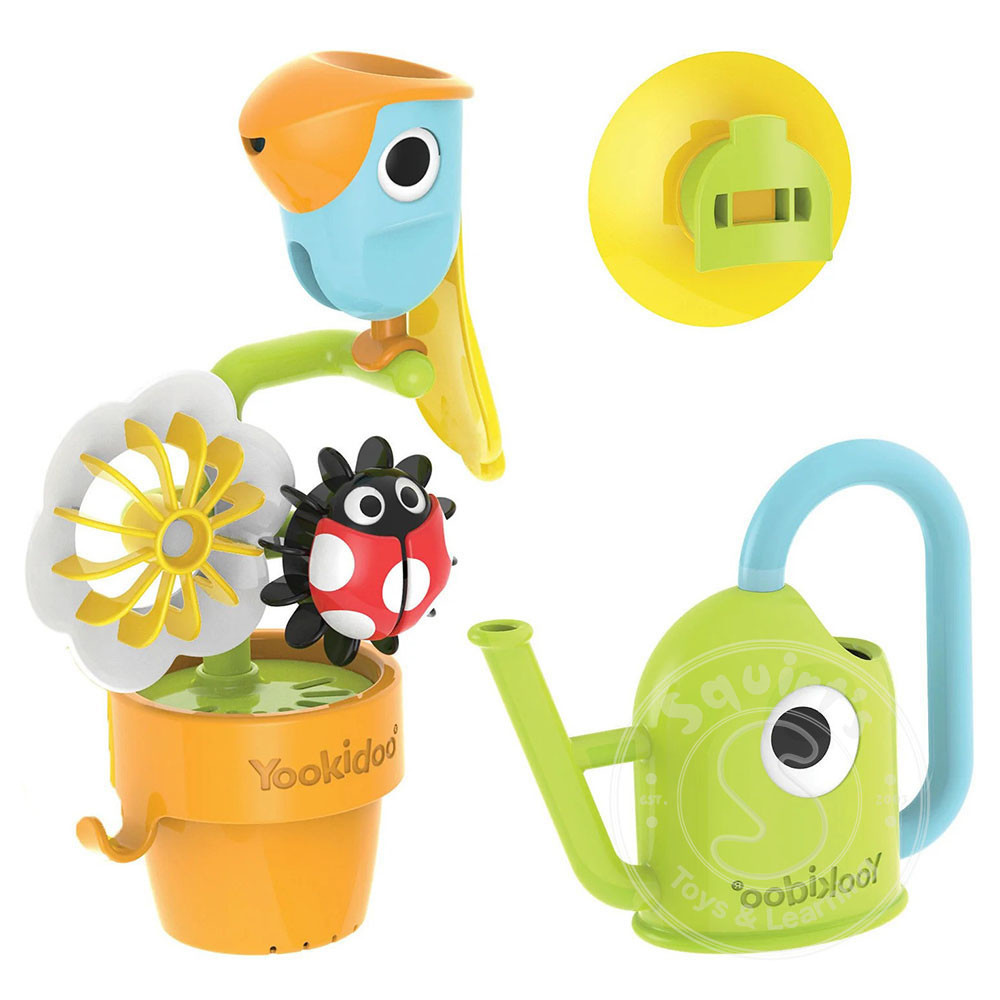 A garden themed bath toy- a flower pot with a tipping bird, spinning flower and ladybug. Also includes a watering can that can be used to water the bird at the top of the flower pot and set off a chain reaction of fun!...