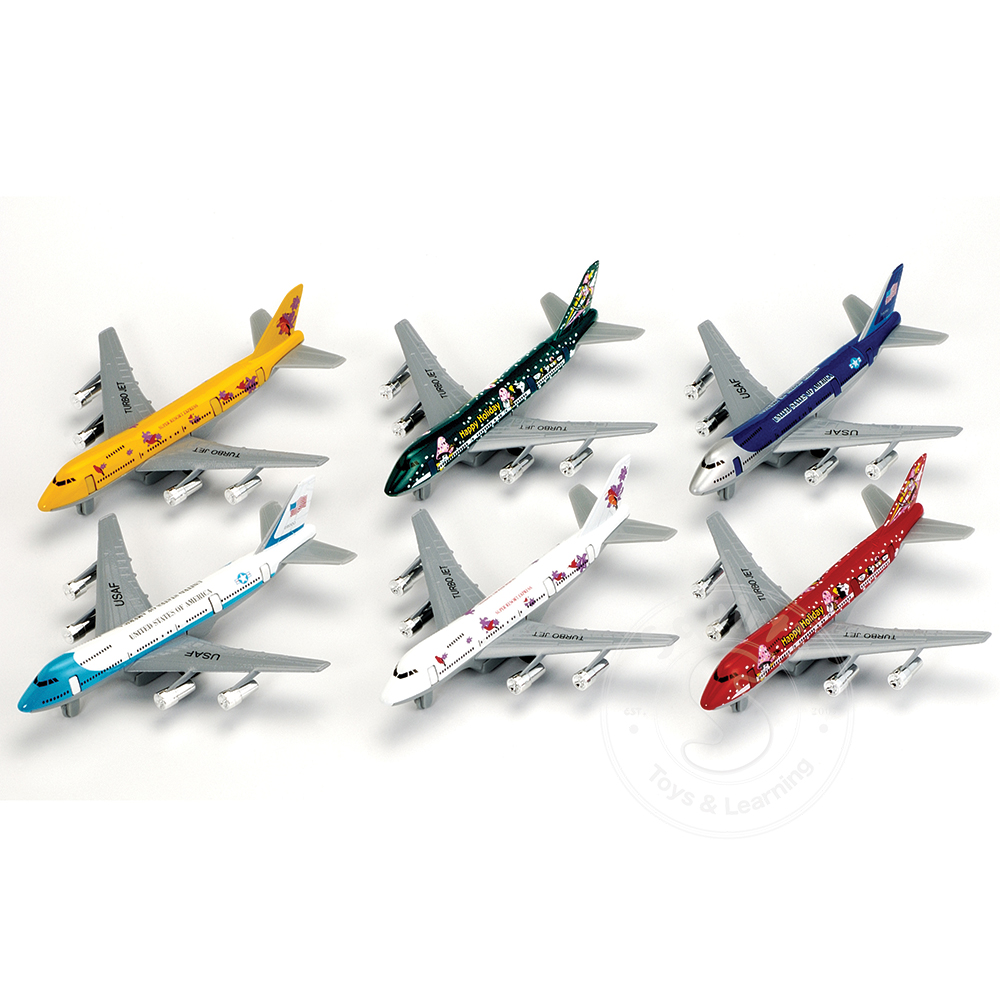 Pull-back this die-cast 747 airplane and it tilts up ready for takeoff as it goes forward. Doors open and close with the flick of a switch. 7” long, 6.5” wingspan. Ages 3+