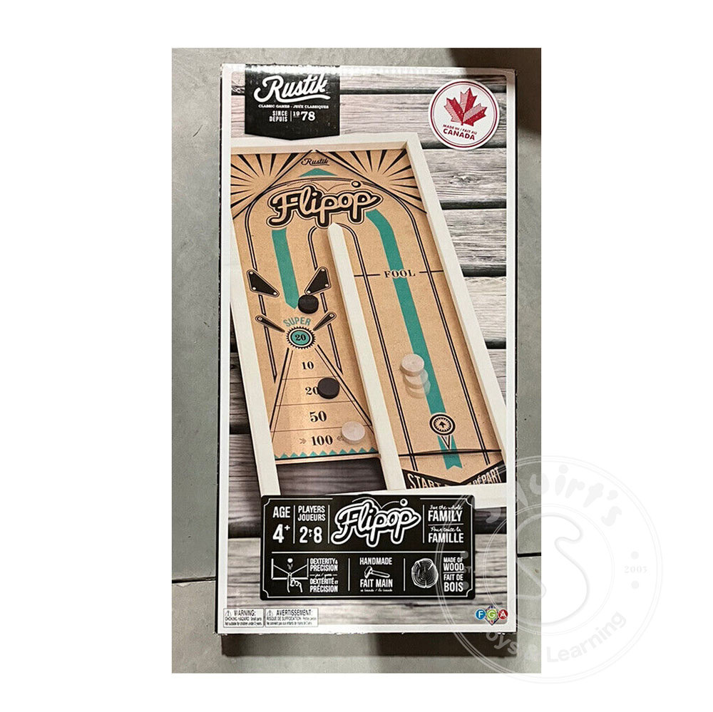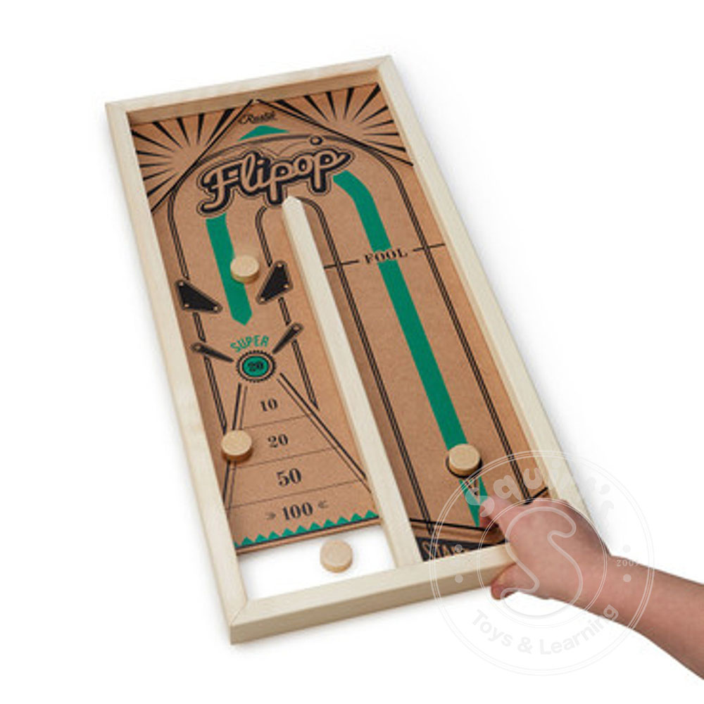 A great wooden version of a shuffle board or pin-ball game, players use the elastic band as a pull and push force instead of paddles, trying to be the first to accumulate 1000 score points. Ages 6+