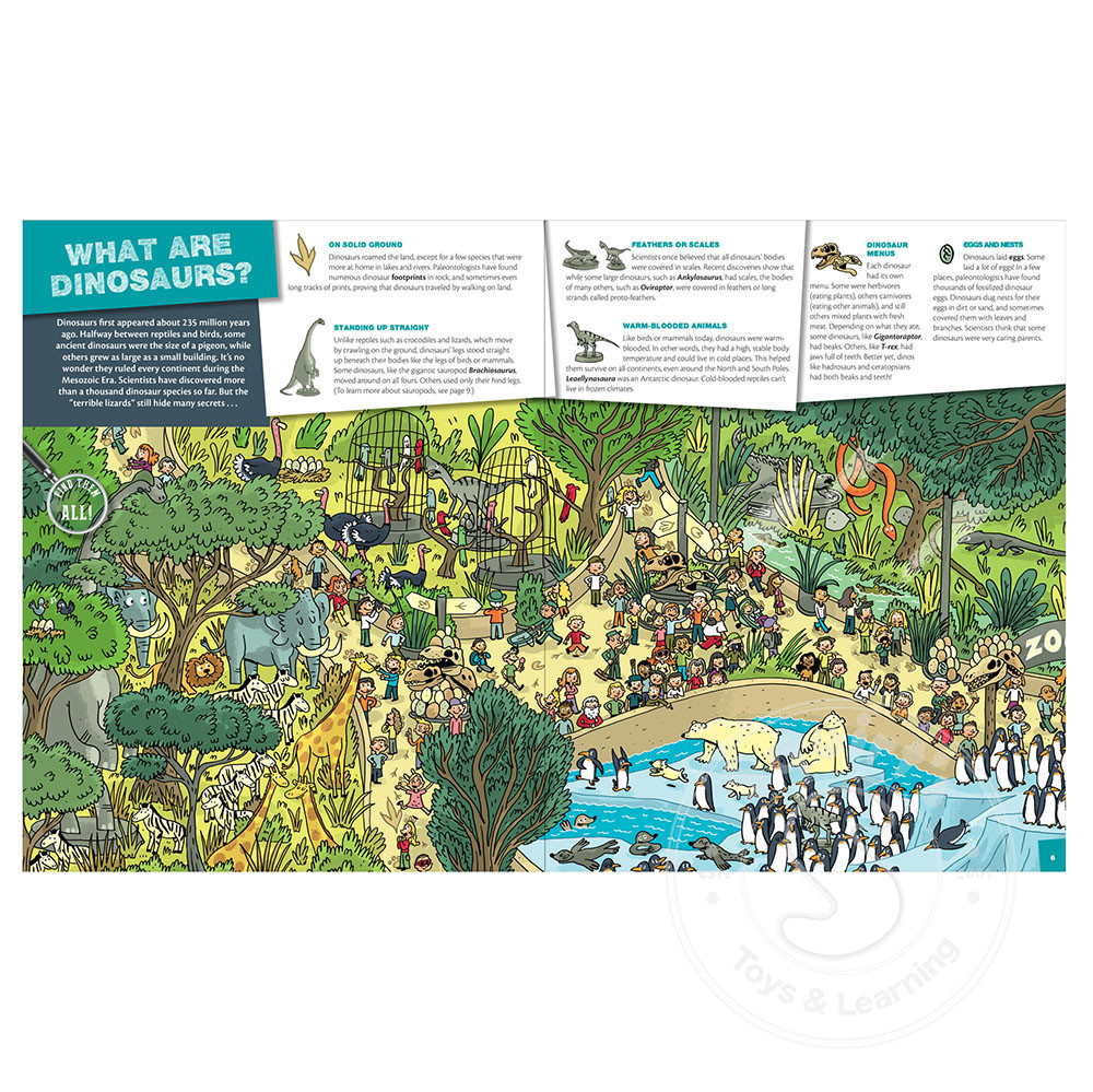 Learn what makes a dinosaur a dinosaur; what Earth was like when dinosaurs were alive; and how scientists uncover dinosaur bones with real-life seek and find skills!