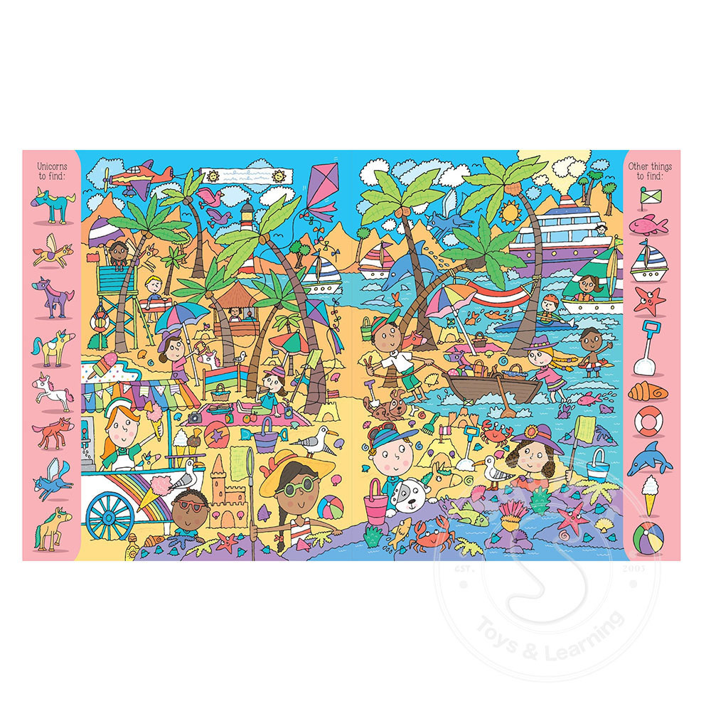 Explore a world of unicorns with this Seek and Find book! Find unicorns and more in this colorful, magical search-and-find book. From a castle to a beach, from a unicorn dance party to a fairy grotto, search 11 magical scenes for hidden characters...