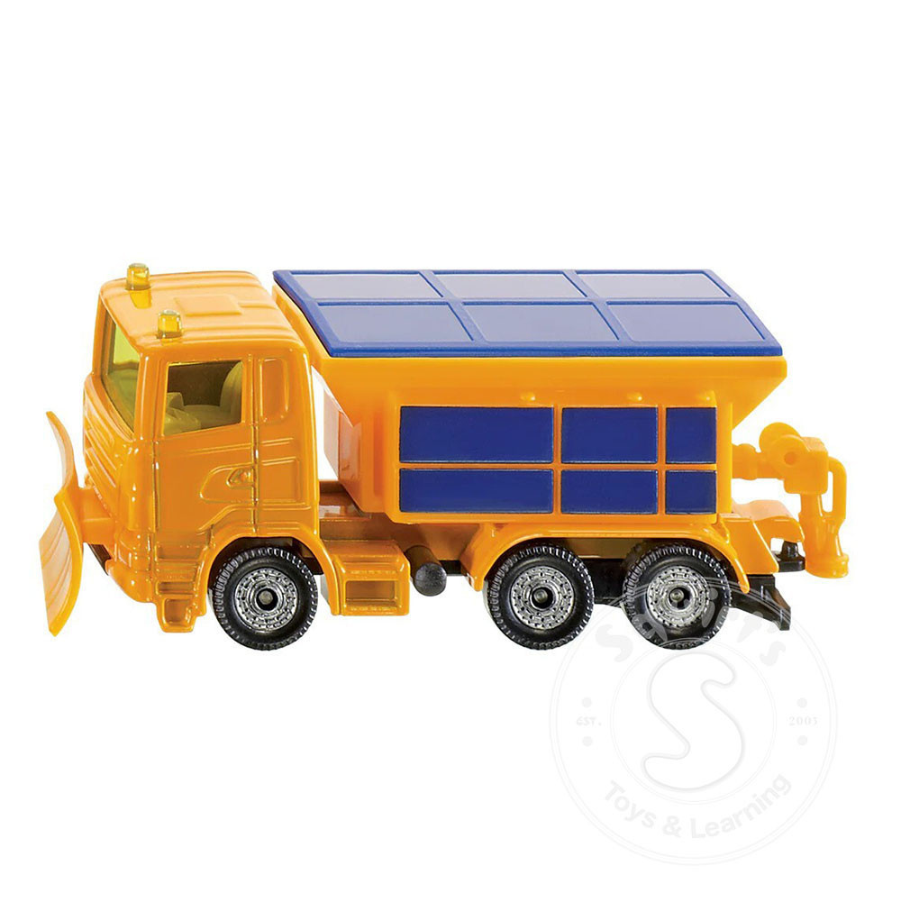 Siku - Snow Plow: Truck with winter service equipment on 3-axle chassis. Die-cast metal driver's cab. Plastic spreader and front snow plate. Smooth-running wheels.
