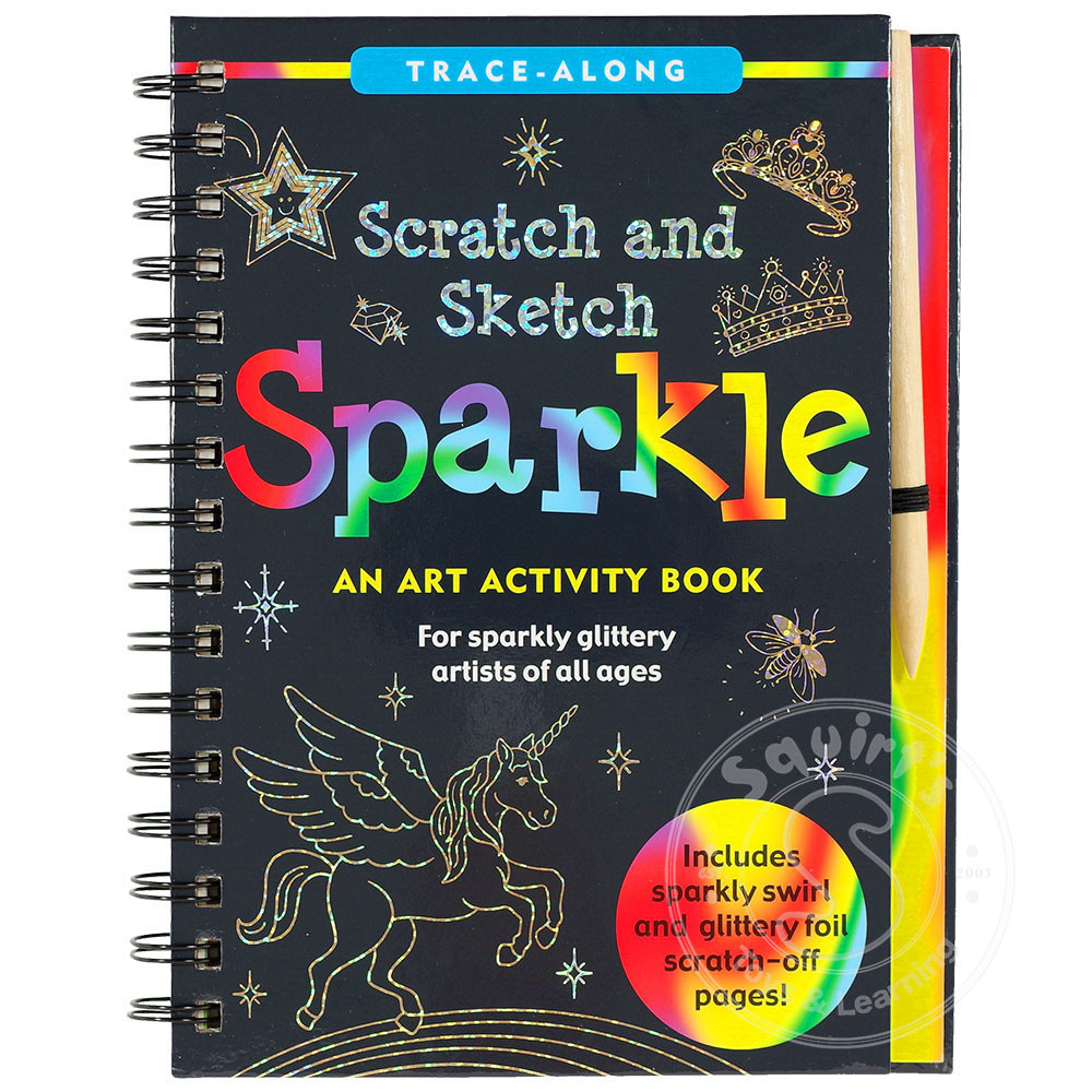 This is a Trace-Along Scratch and Sketch! Use the wooden stylus included to trace the white outlines on the black-coated pages and reveal the glittery foil and rainbow-swirl colors beneath!
