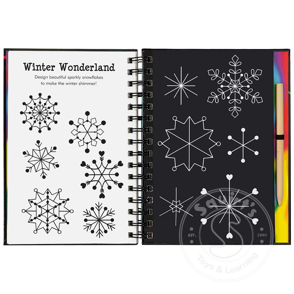Book contains 20 black-coated scratch-off pages, 20 illustrated pages with fun text, and 20 extra pages for independent drawing and sketching.