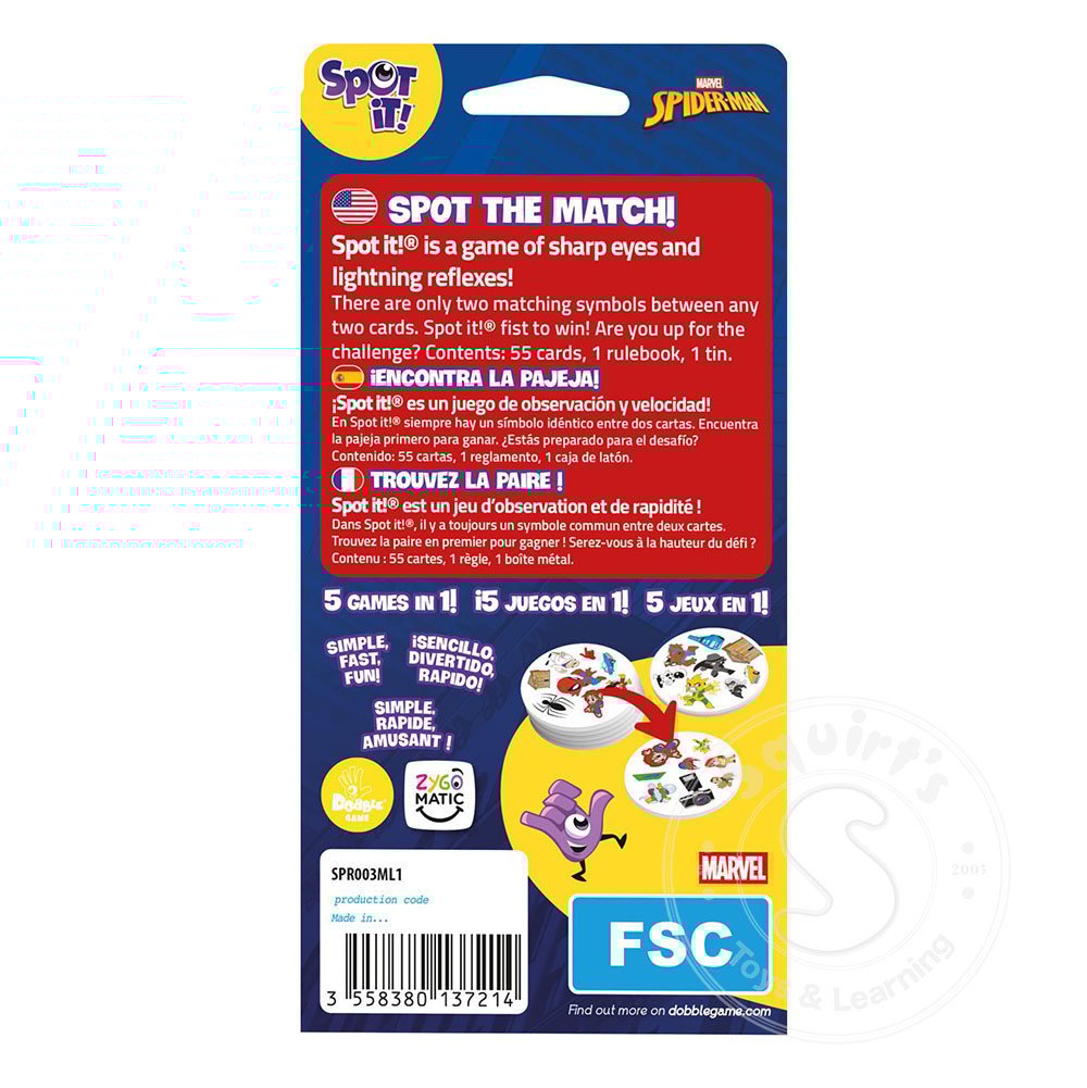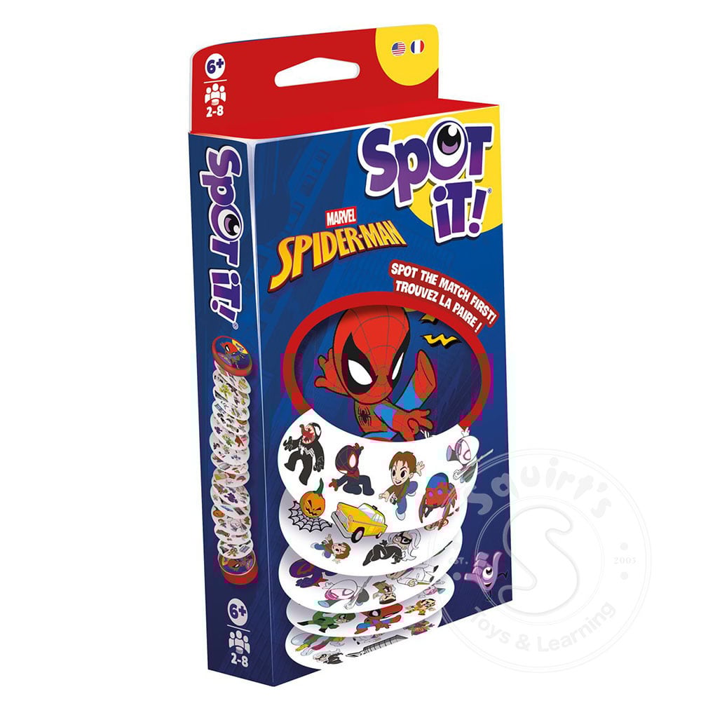 Test your observational skills and hone your reflexes with the award-winning gameplay of Spot It Spiderman! A game of lightning-fast choices. Spot It is a visual perception card game in which players race to find the one matching picture between one...