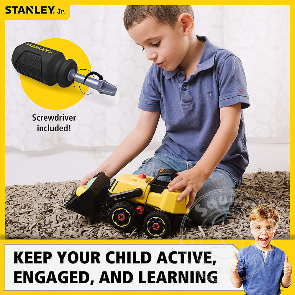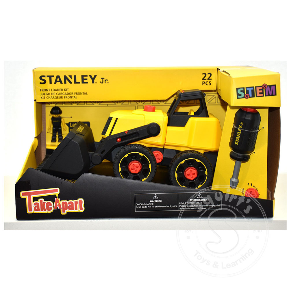 The Stanley Jr. Take Apart XL Front Loader kit can help you clean up after play time with its front loader. Including 24 pieces, a screwdriver and a figurine, this kit is really the whole package. Let’s go to work!