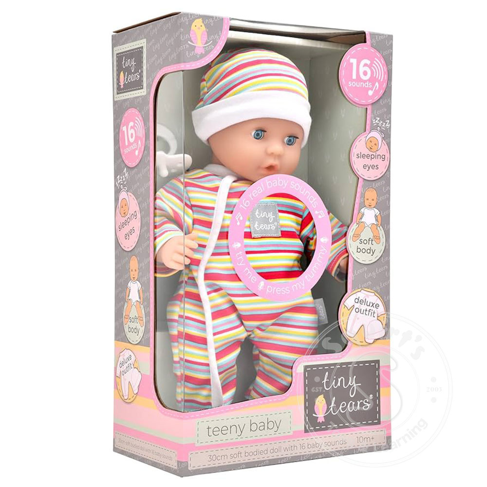 Teeny Baby Tiny Tears doll with 16 real sounds and sleeping eyes who needs lots of love and care just like a real baby. This adorable cuddly 30cm soft bodied doll is wearing a cosy all in one babygro and hat...