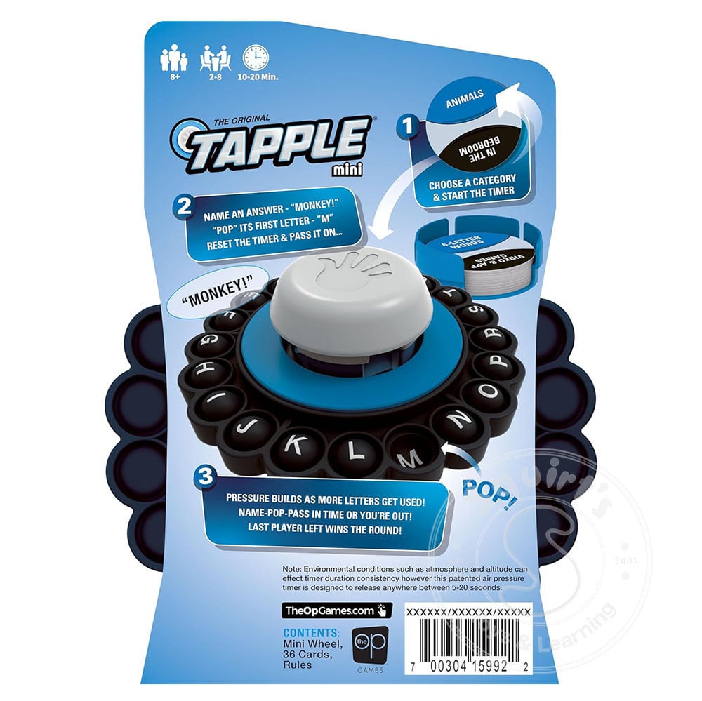 - Gameplay: Players take turns within 10 seconds naming a word for a chosen category and pressing the corresponding letter on the Tapple wheel.