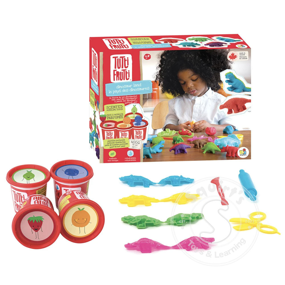 4 400g tubs of Tutti Frutti modeling dough in lime, blueberry, strawberry and orange, 4 x dino pressure molds, 1 x plastic scissors, 1 x modeling tool, 1 x rolling pin.