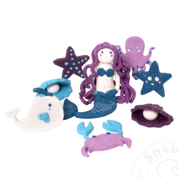 Includes: Three 100g/3.5 oz tubs of yellow pear, purple grape and blue blueberry scented sparkling modelling dough, clam, starfish, mermaid, dolphin, whale, octopus and crab plastic cutout molds, 1 x zippered fabric carry bag. Bag measures 27.3 x 21 x 9 cm (10.75 x 8.25x 3.5 inches).